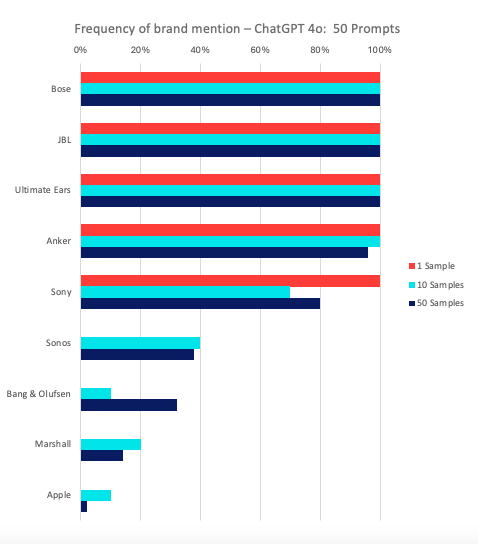 But at 100 prompts, a consistent hierarchy stabilizes—offering a clear signal marketers can trust.